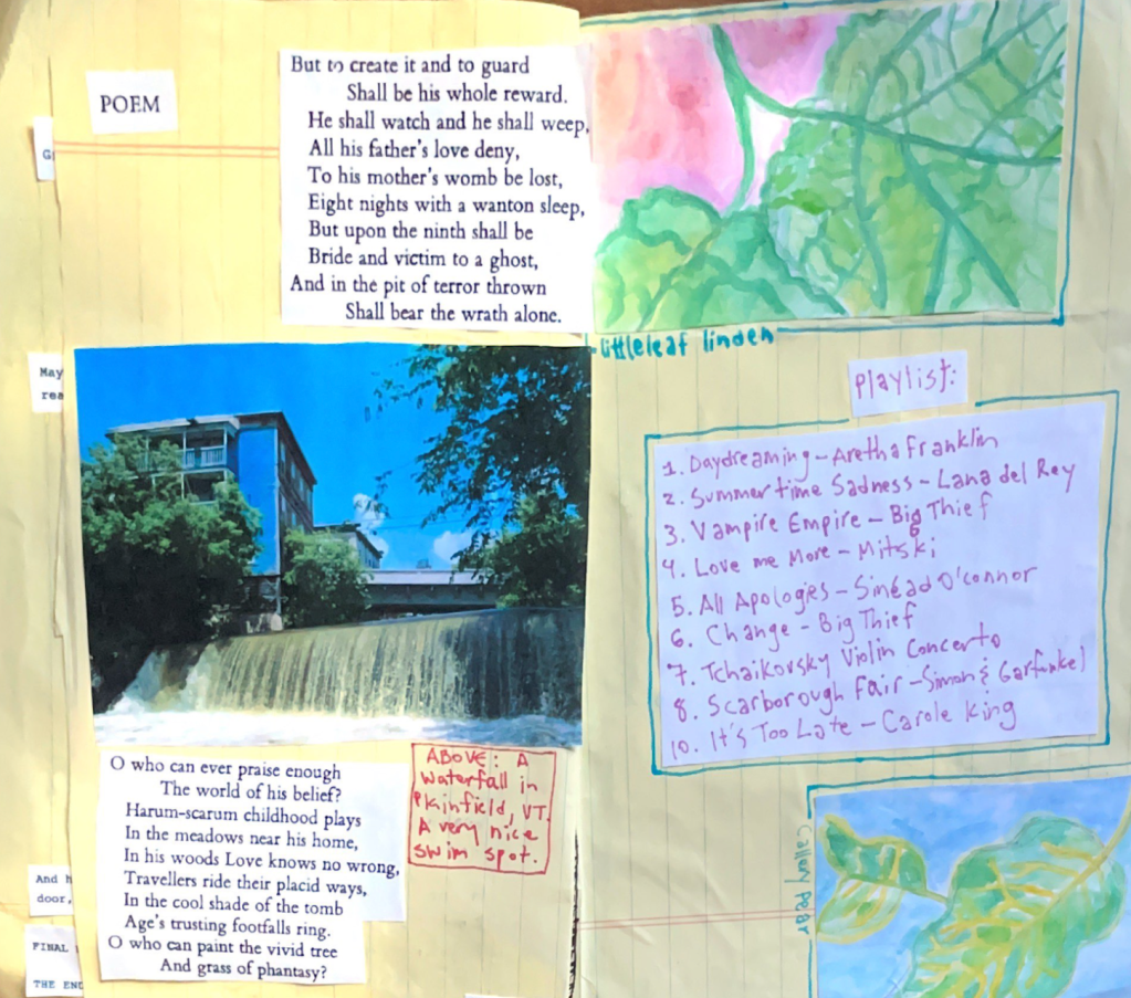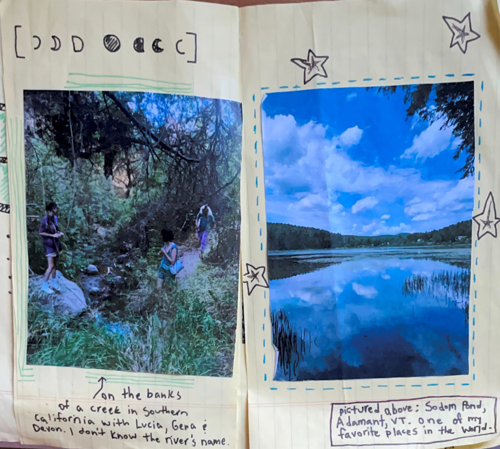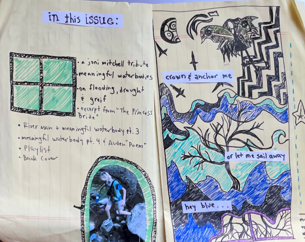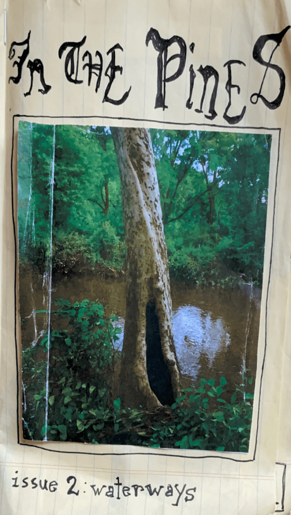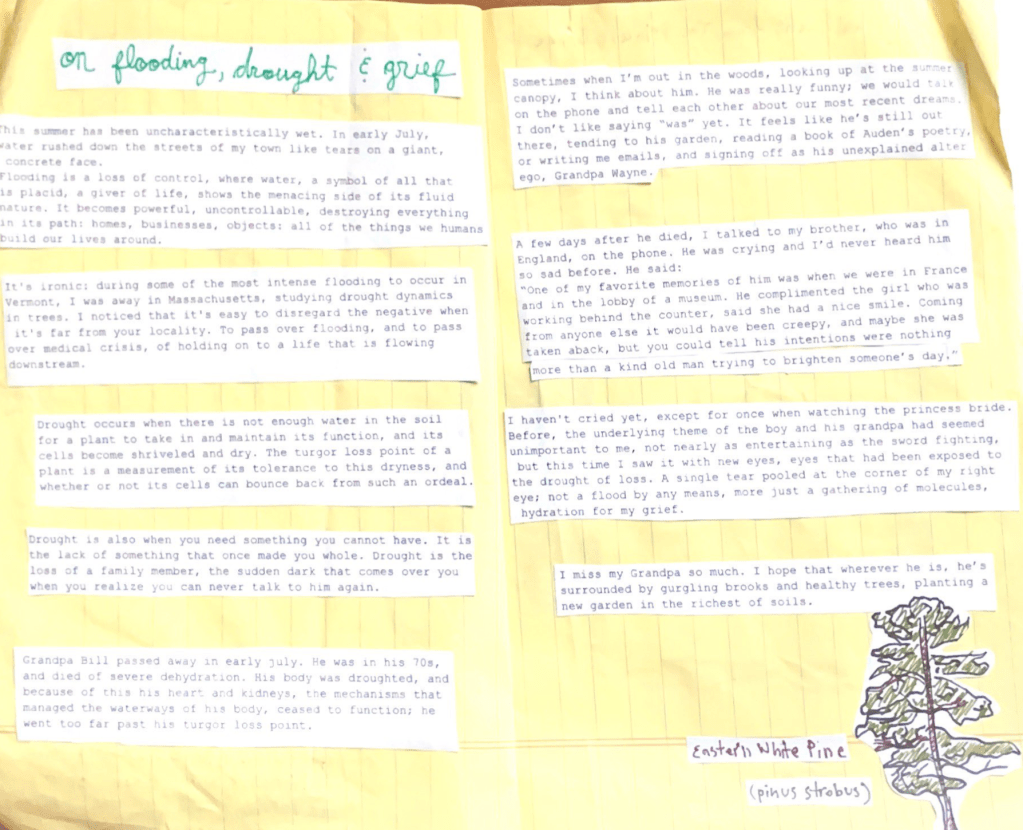 These musings led to the creation of the second issue of in the pines, where I continued to explore the ability of waterways to connect disparate entities. I tied this into the connection between the work I was doing in the lab (water potential and drought resilience) and personal challenges from my life, namely the death of a family member earlier in the summer, and the flooding of my hometown during the first week of my internship. Completing the zine was cathartic, and also helped me synthesize to reflect on and synthesize the relationships between water and trees; how the movement of water in and outside of biological bodies can enhance or inhibit the way they work.