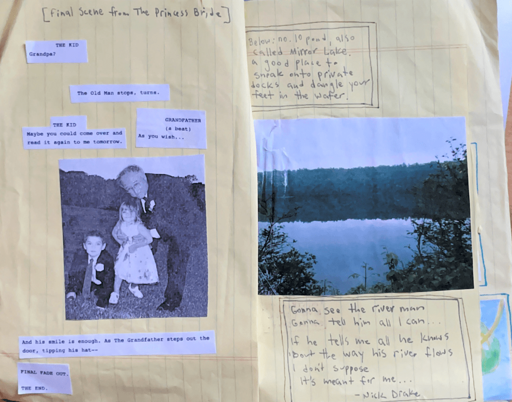 Below is a scan of the second iteration of my zine, In The Pines. This issue focuses on waterways, and was inspired by a late afternoon walk I took this summer along the Mill River path, while I was staying on campus for my internship. I waded into the river, still slightly murky from recent rainfall, and thought about rivers and roads. I liked the idea of the river as a passageway, and pictured myself as a tiny leaf, floating down the current like a boat, wondering where I would end up.