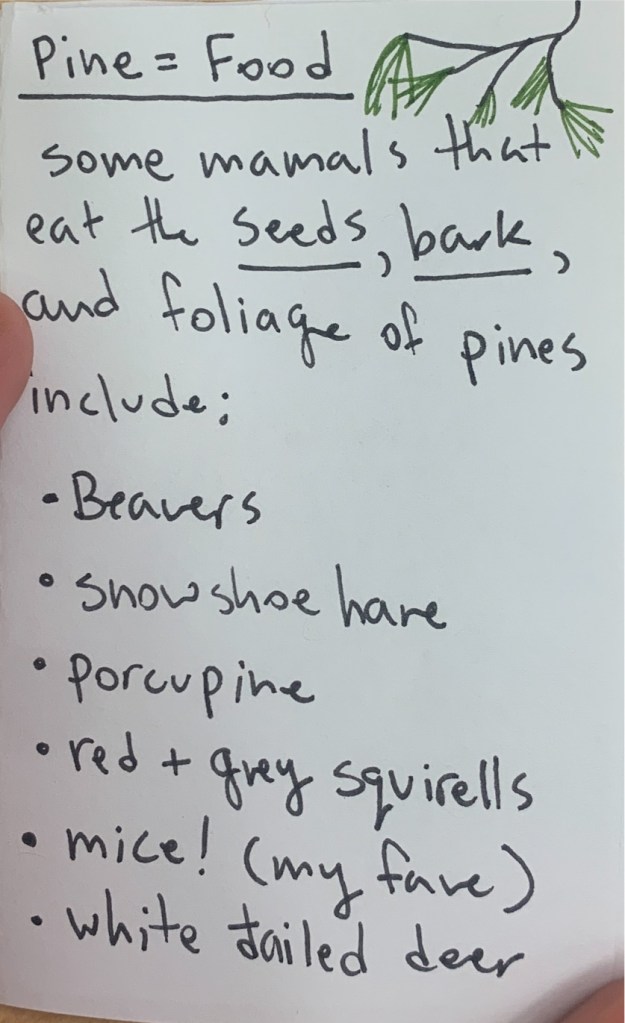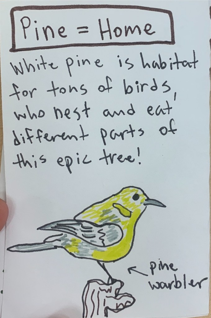 The lates issue of In the Pines has arrived! This one is a mini edition focused on the pine tree as a habitat, and as an edible resource for animals and even humans! Special shout out to the Pine Warbler as an interesting new bird to learn about, as well as mice for being my favorite animal, and being a mammal that consumes the pine.