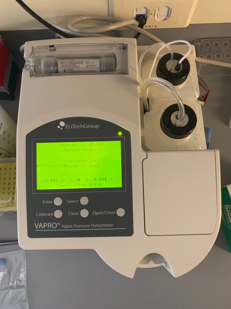 Water potential correlates to the amount of solutes, or “good sugars” in plant cells that can absorb and store water, keeping the plant hydrated. These solutes can be measured by the vapor pressure osmometer, a machine which I have become very familiar with during my time in the lab. Solute potential is closely tied to drought tolerance, because the higher amount of solutes (also called osmolytes) within a plant indicate a higher capacity of this plant to deal with low water availability. In other words, the higher the solute potential, the more drought tolerant the plant is!